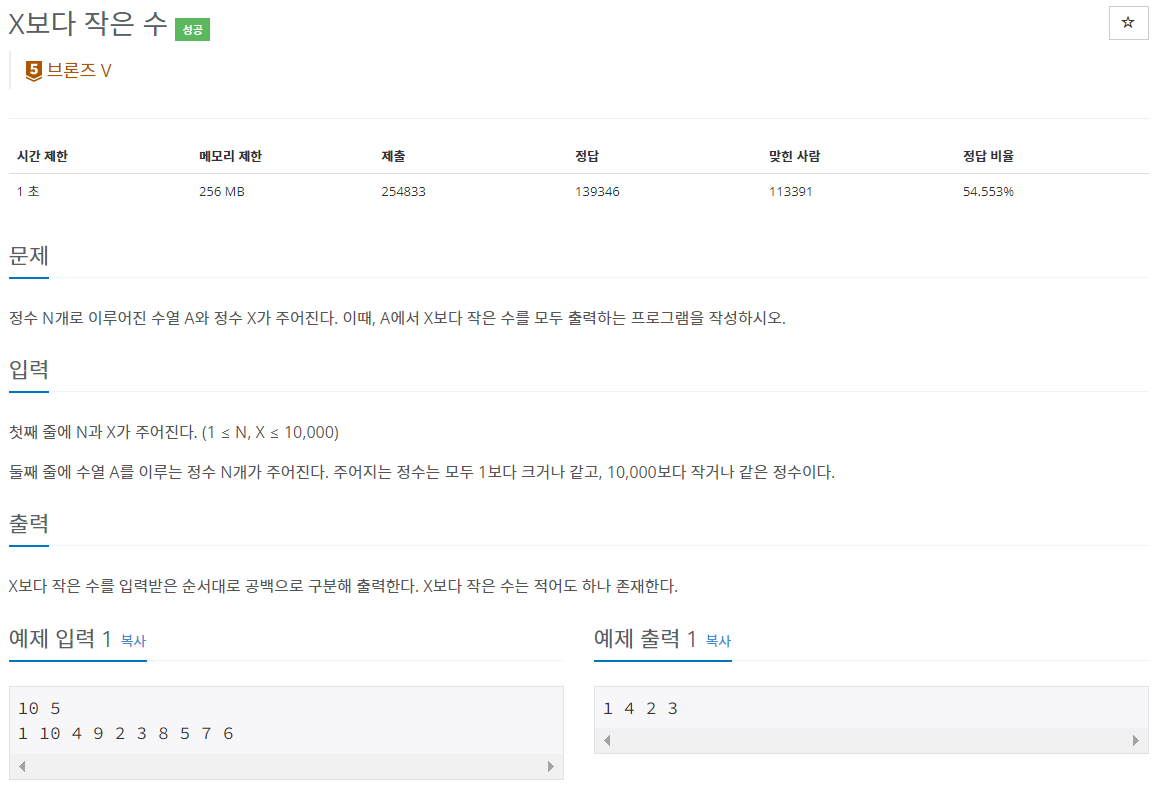 그러면 둘째 줄에 입력된 수들 중 X보다 작은 수를 입력받은 순서대로 출력한다.