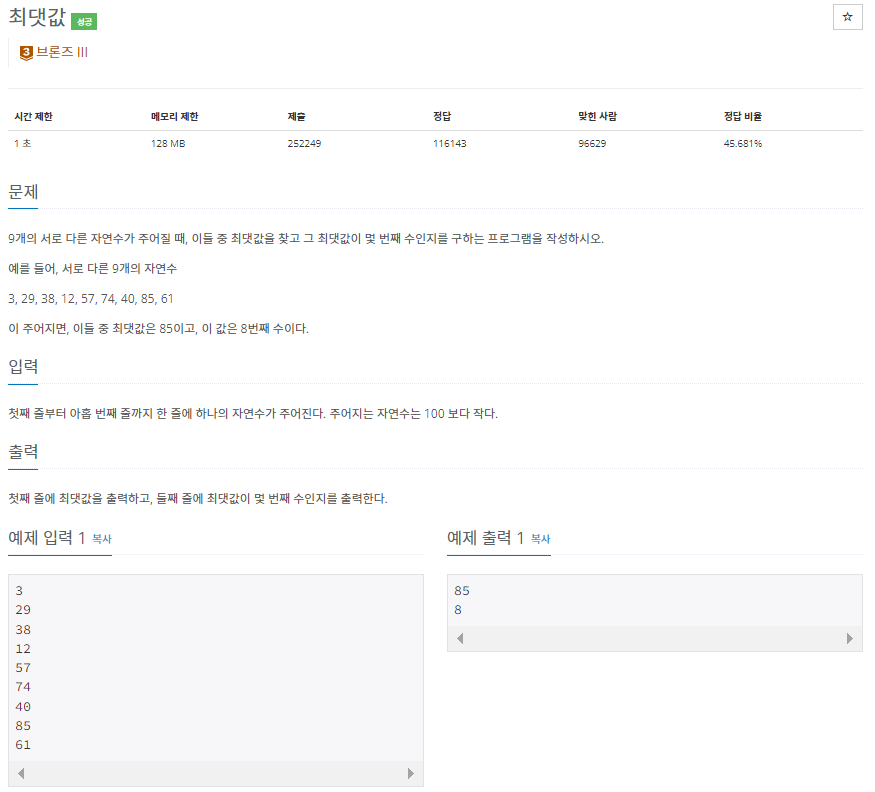 이번에는 9개의 서로 다른 수가 주어질 때 최댓값을 찾는 문제이다.