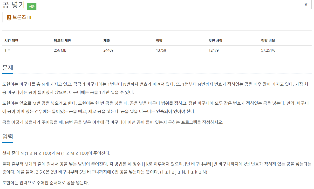 도현이는 바구니를 총 N개 가지고 있고, 각각의 바구니에는 1번부터 N번까지 번호가 매겨져 있다. 또, 1번부터 N번까지 번호가 적혀있는 공을 매우 많이 가지고 있다. 가장 처음 바구니에는 공이