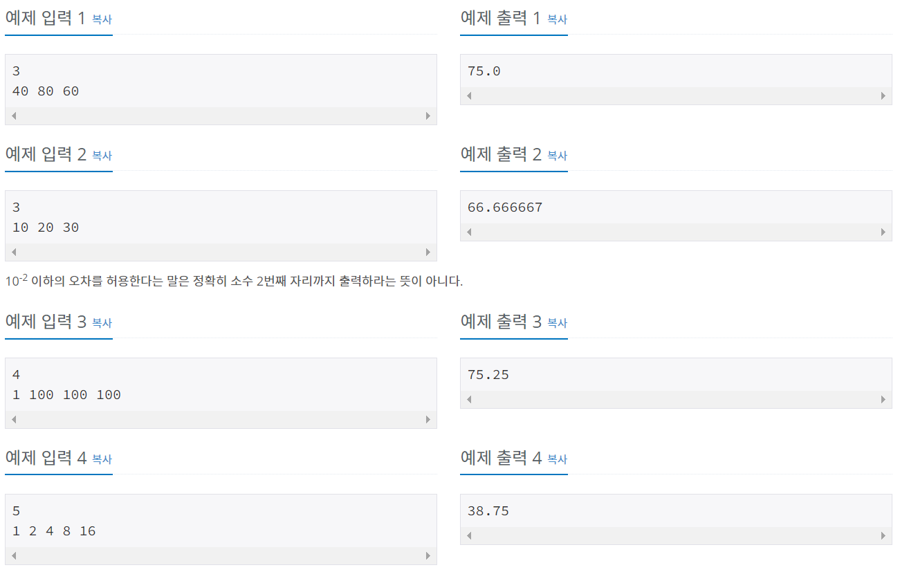 첫째 줄에 시험 본 과목의 개수 N이 주어진다. 이 값은 1000보다 작거나 같다. 둘째 줄에 세준이의 현재 성적이 주어진다. 이 값은 100보다 작거나 같은 음이 아닌 정수이고, 적어도 하나의 값은 0보