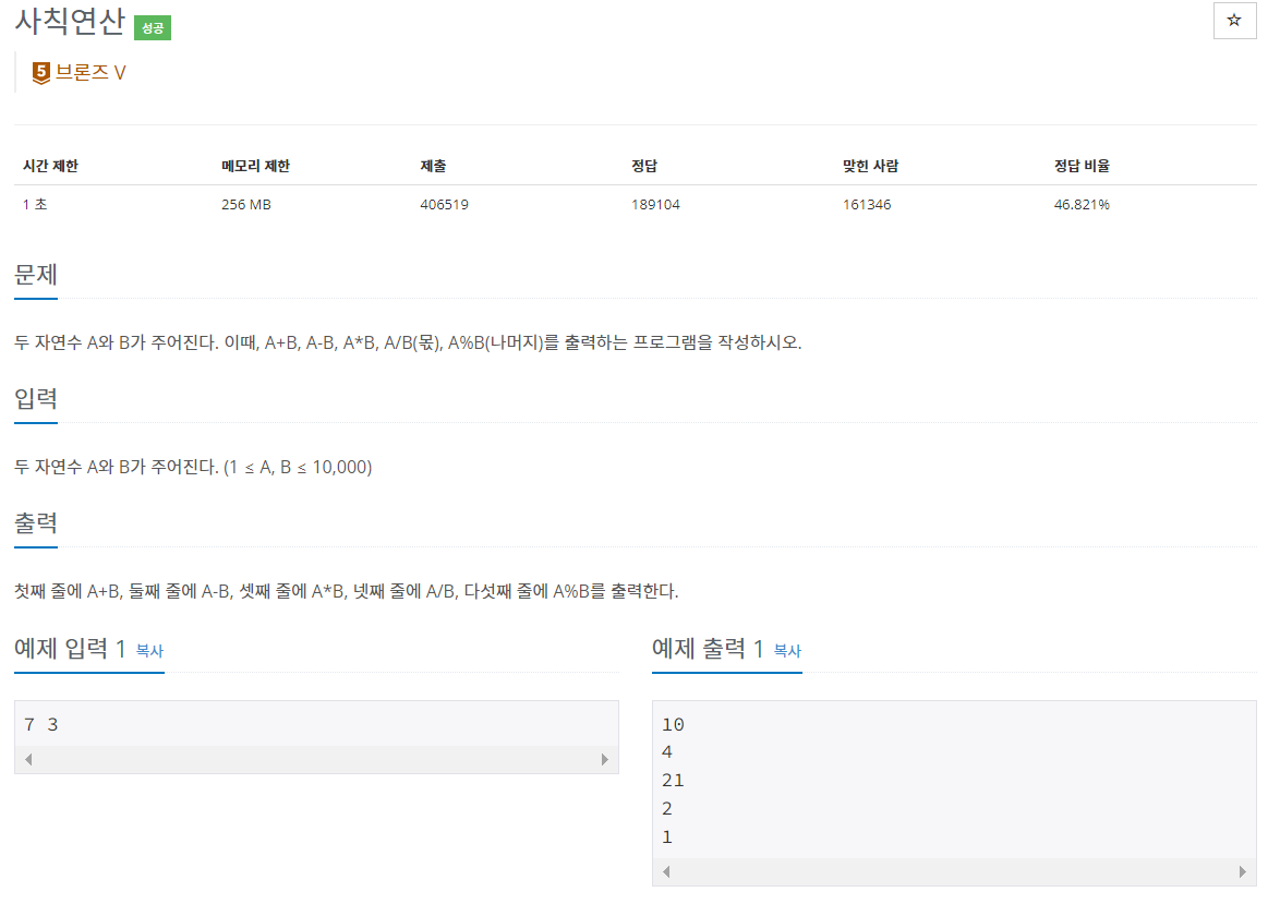 두 자연수 A와 B가 주어진다. 이때, A+B, A-B, A*B, A/B(몫), A%B(나머지)를 출력하는 프로그램을 작성하시오.