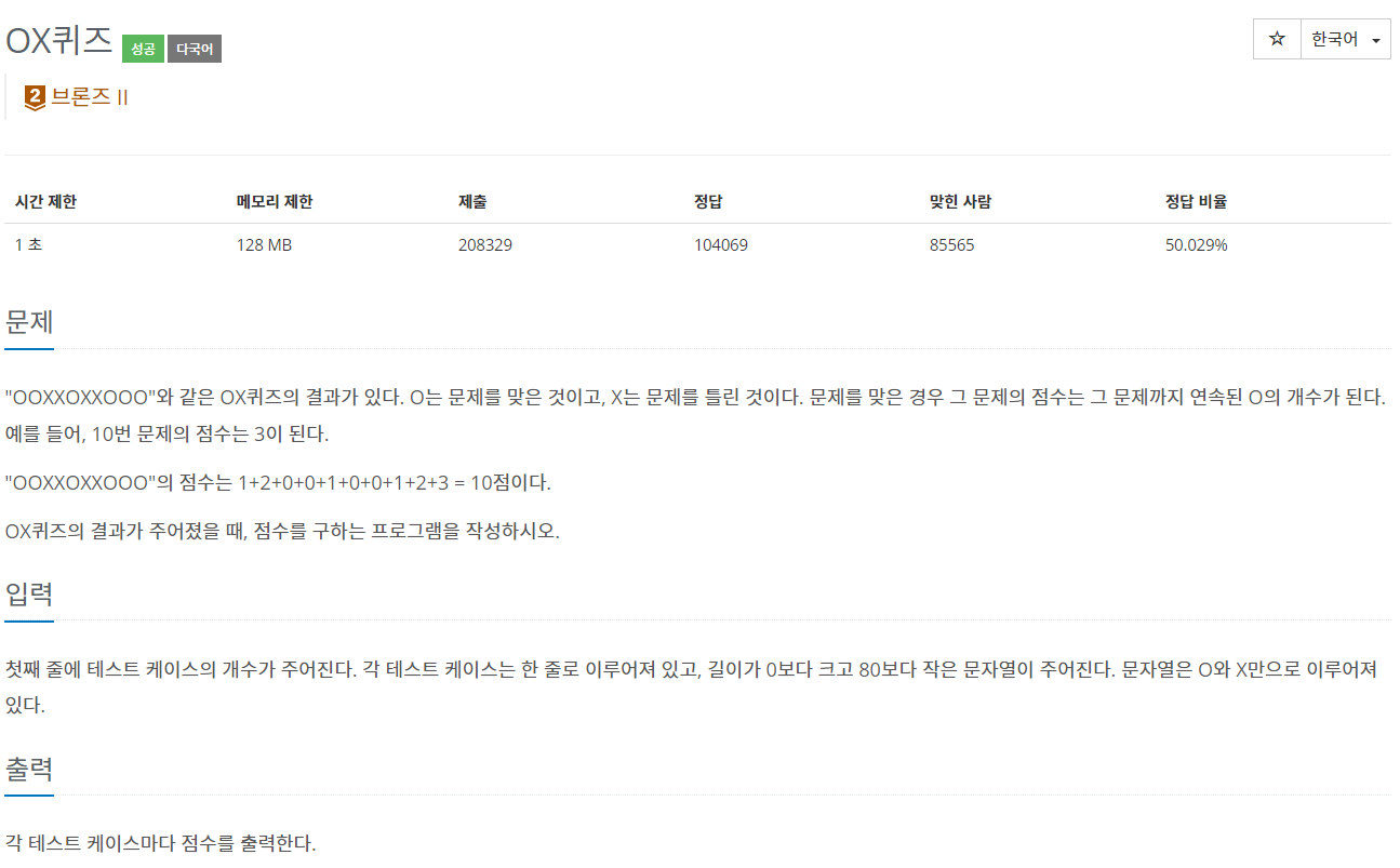 "OOXXOXXOOO"와 같은 OX퀴즈의 결과가 있다. O는 문제를 맞은 것이고, X는 문제를 틀린 것이다. 문제를 맞은 경우 그 문제의 점수는 그 문제까지 연속된 O의 개수가 된다. 예를 들어, 10번 문제의 점수